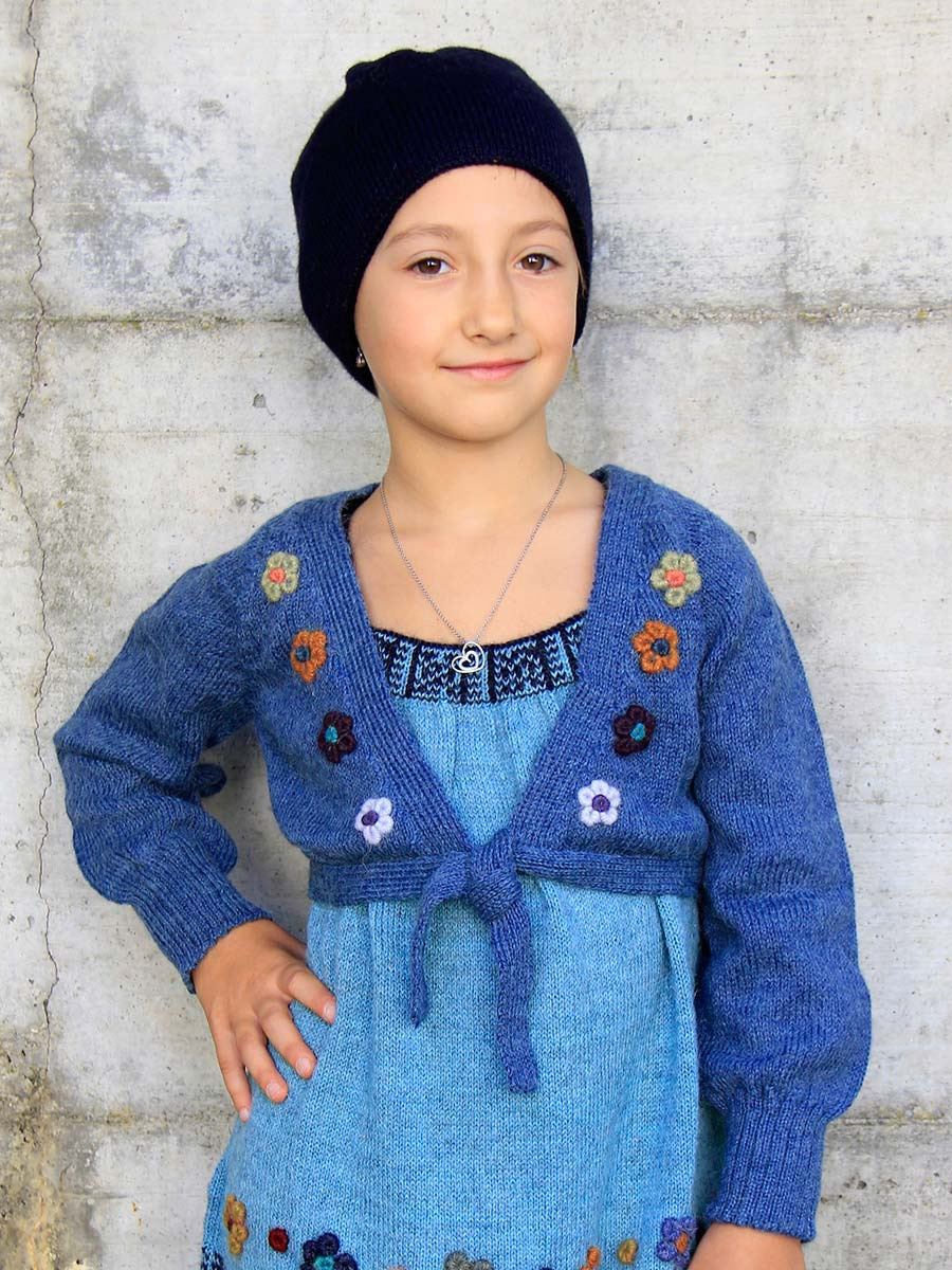Cardigan bimba Flower Junior: Un cardigan aperto ricamato con splendide rose applicate lungo tutto il bordo dell’allacciatura, con bottoni in ceramica dipinti a mano. È un modello esclusivo per bambina, romantico e unico, che non passa mai inosservato.
